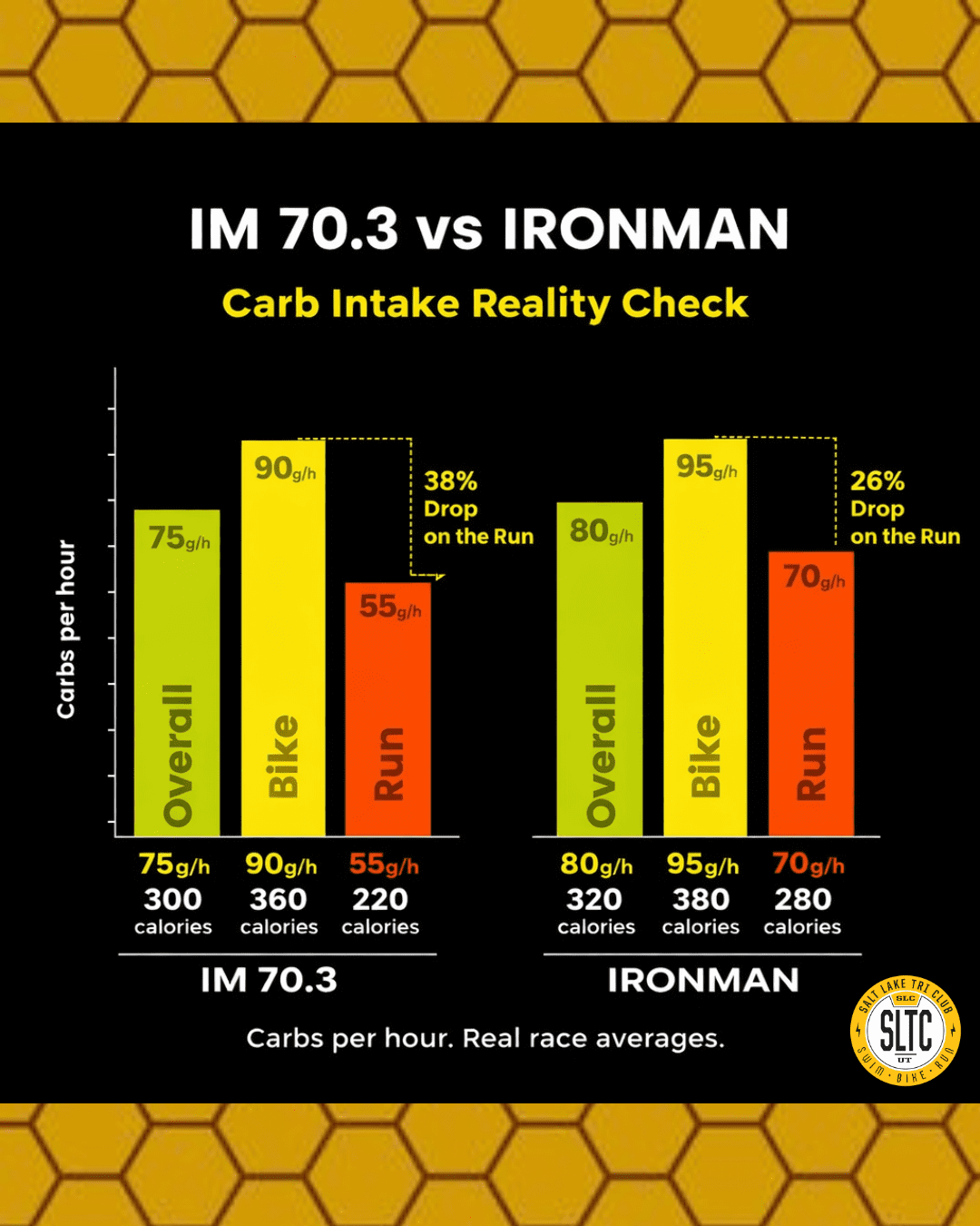 You’ve seen this athlete. Okay swim. Great bike power. Then the run turns into survival mode by mile six. When you look at their fueling, it’s usually one bottle per hour with maybe one gel. That’s often 30 to 40 grams of carbs per hour on the bike. They start the run already low.